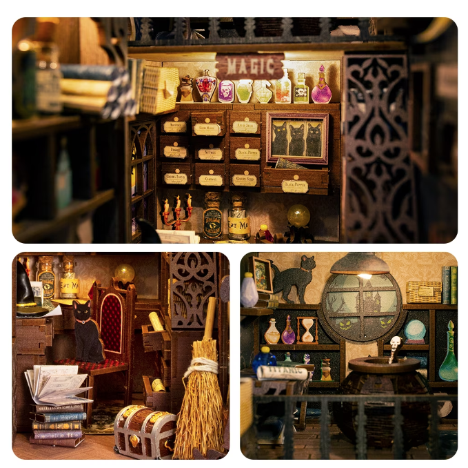 - CONCEPTUL DE DESIGN UNIC - Designul enigmatic si magic, va permite sa va scufundati in lumea magica a fanteziei. Intr-o casa magica situata in adancul padurii, farmacistul magic citeste carti magice si incearca sa faca medicamente in efortul de a stapani o putere misterioasa prin magie pentru a schimba lumea, a deschide usa catre lumea magica si a ne conduce. pas cu pas in calatoria unei aventuri fantastice. Creuzetul, sticla de potiune, pisica neagra, cartea magica, matura delicata si enigmatica sunt toate elemente ale acestei atmosferi misterioase.