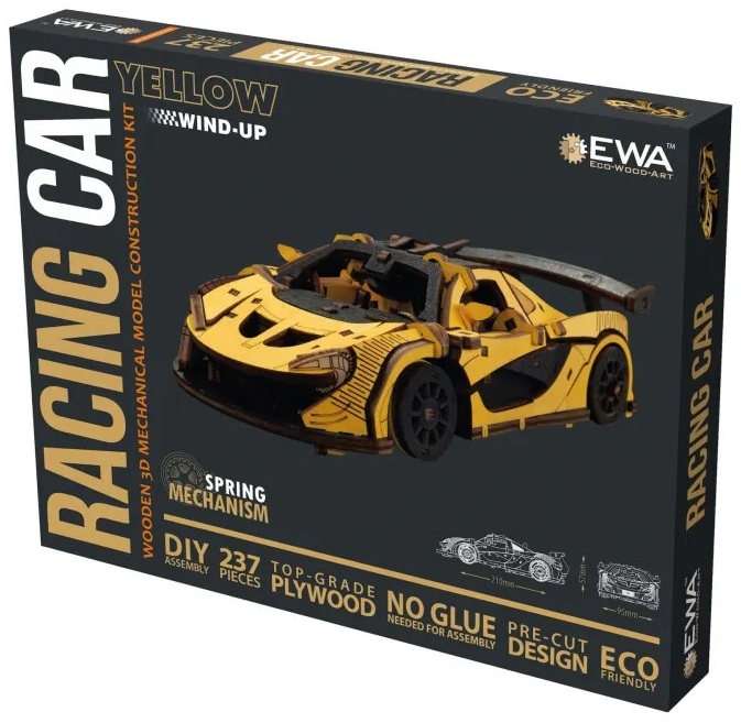 Puzzle 3D din lemn - Masină de curse galbenă este alegerea perfectă pentru pasionații de curse auto, iubitorii de transport și colecționari!