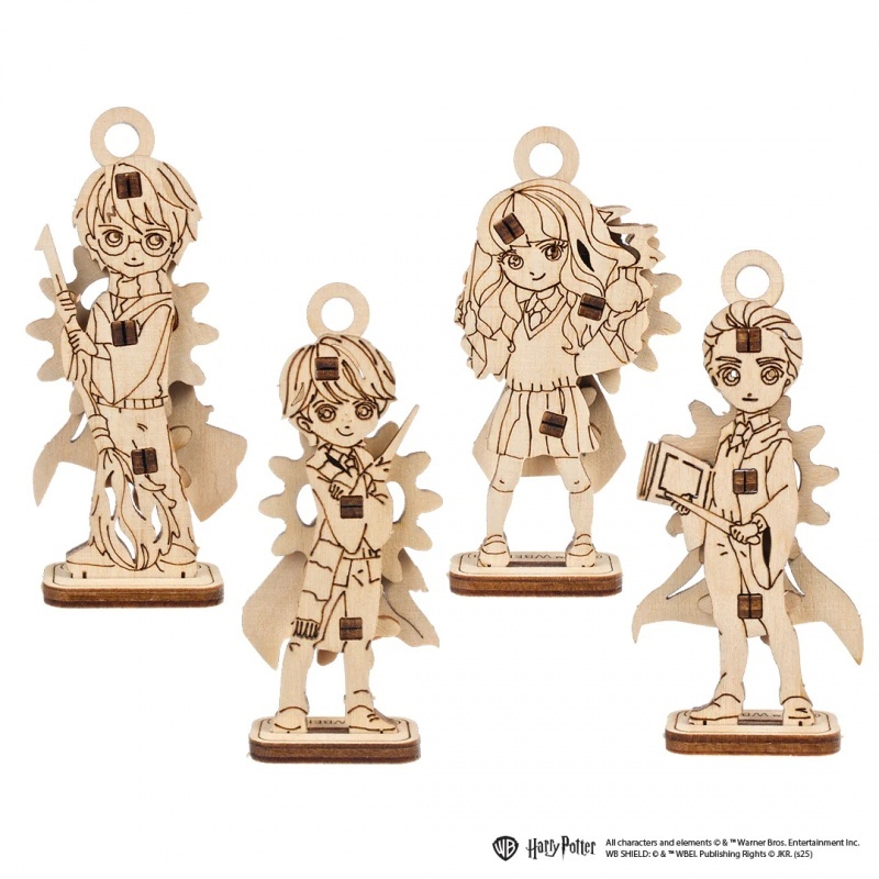 - Harry Potter (3 x 6,5 x 1,5 cm) – un vrajitor curajos si hotarat care descopera ca este faimos in lumea vrajitorilor pentru ca a supravietuit unui atac al vrajitorului intunecat Voldemort inca de cand era copil.