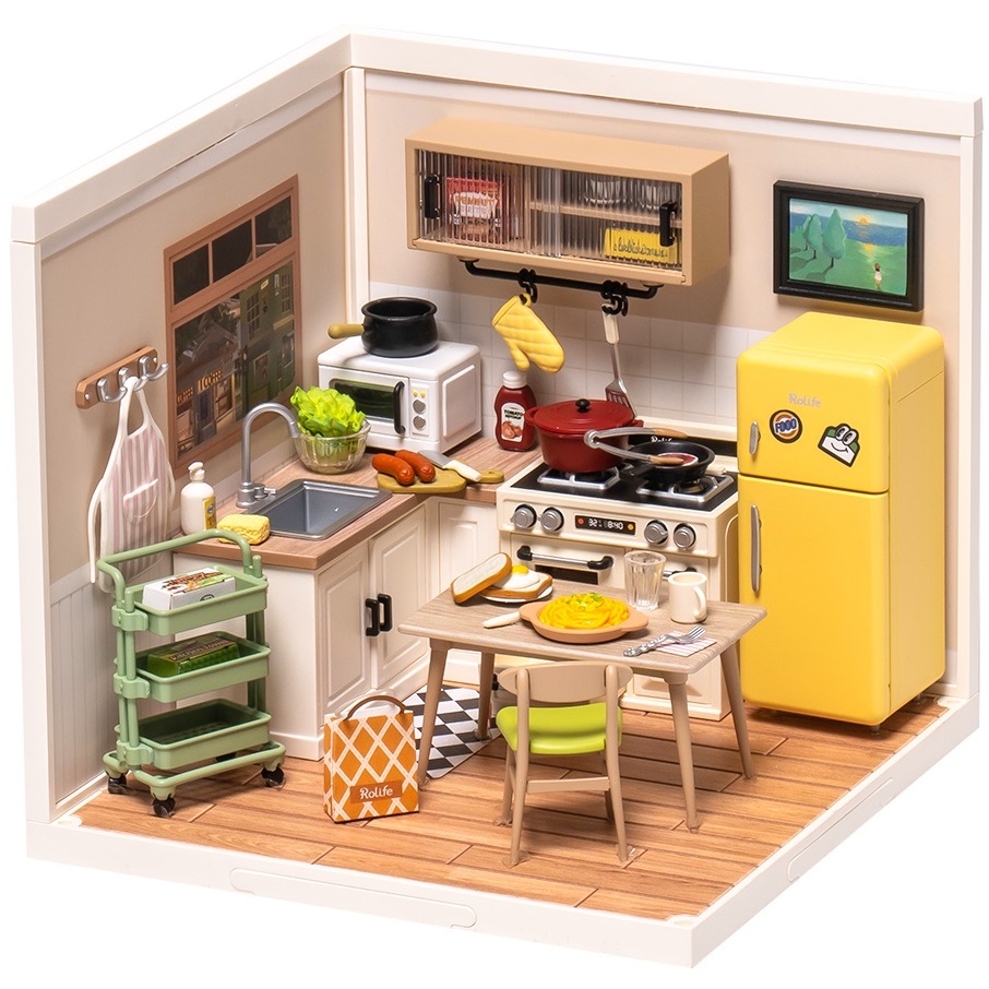 Construiește o zonă de gătit simplă și confortabilă cu Minicasuta DIY Rolife Happy Meal Kitten. Setul conține aparate și accesorii realiste pentru o experiență de asamblare ușoară și plăcută.