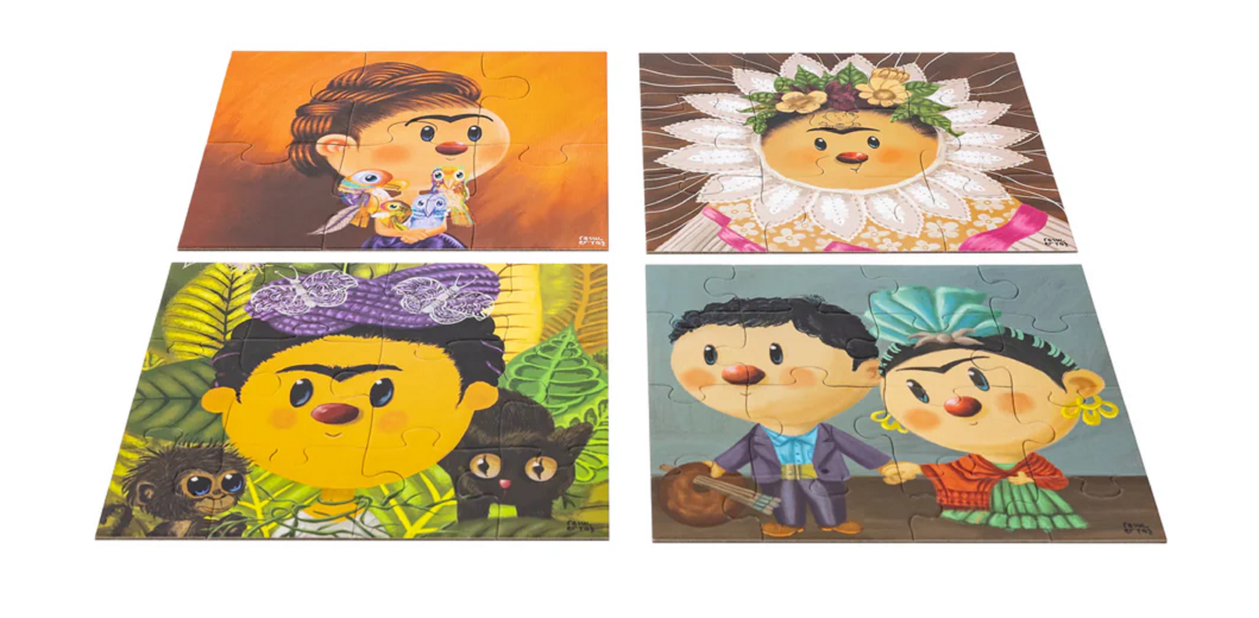Creează-ți propriul mozaic Frida cu acest puzzle 4 în 1! Realizat pentru mâini mici, acest puzzle include patru dintre cele mai emblematice lucrări ale Fridei Kahlo - Autoportret ca Tehuana, Frieda și Diego Rivera, Autoportret cu colier de spini și Pasărea colibri, Eu și papagalii mei - pentru a deschide mințile mici către cei mari. creativitatea acestui important artist.