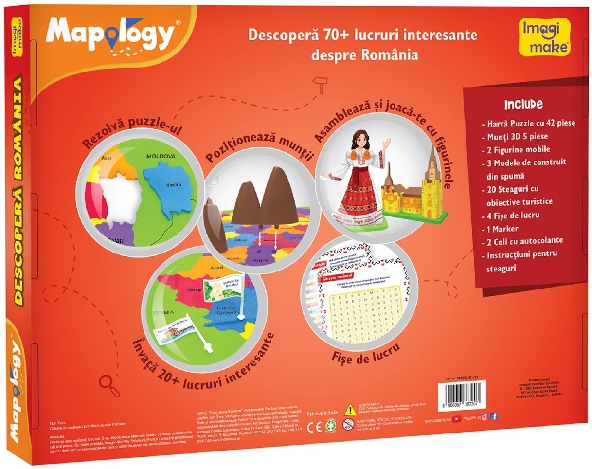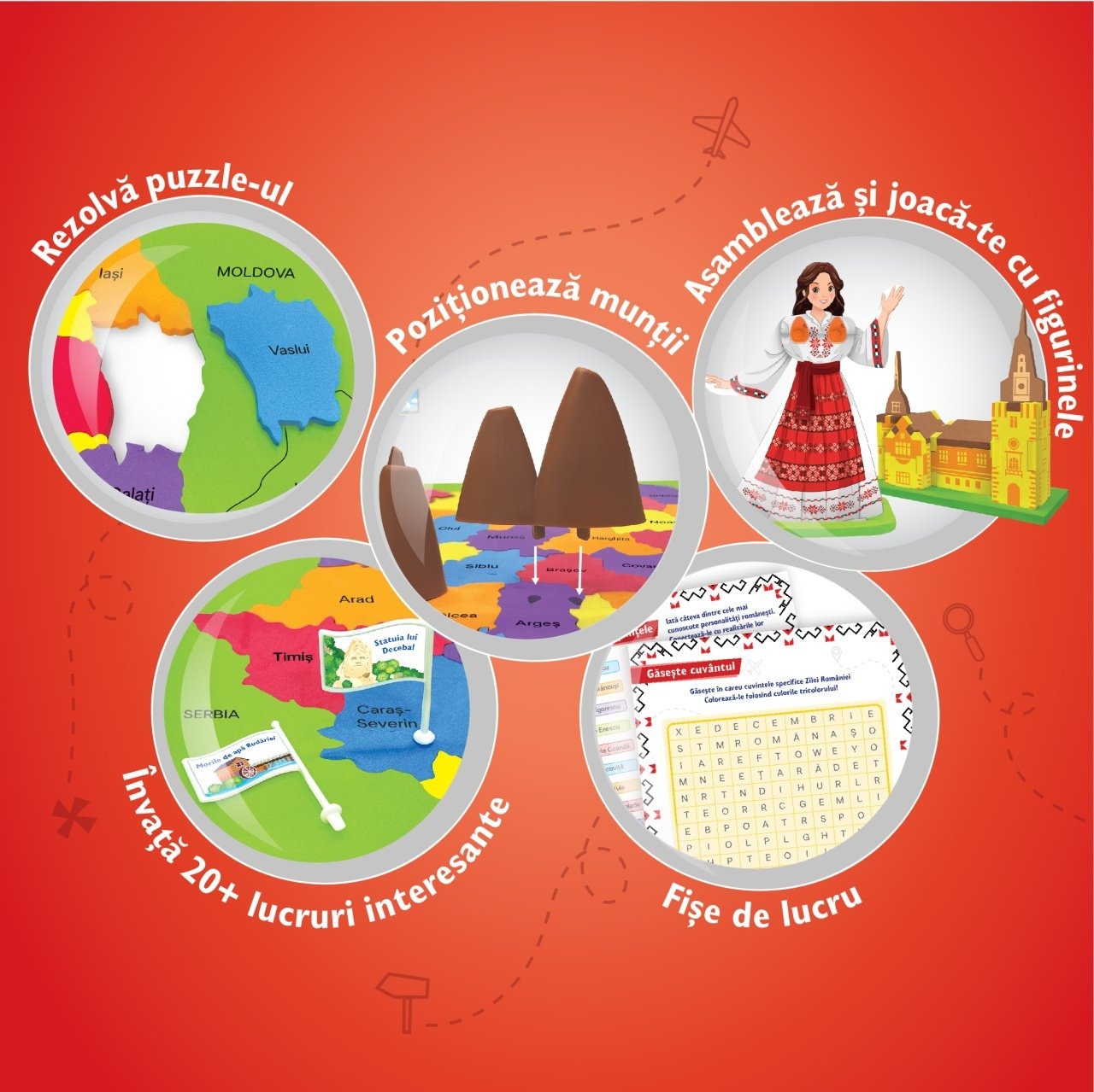 Puzzle 42 piese - Descopera Romania este un produs educativ si recreativ destinat copiilor si familiilor, avand ca scop promovarea cunostintelor despre Romania intr-un mod interactiv si distractiv. Acest set combina un puzzle cu activitati educative, oferind o experienta captivanta pentru explorarea geografica, culturala si istorica a tarii.