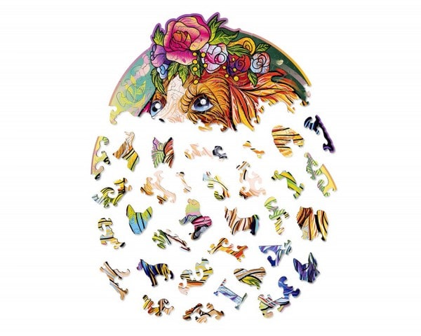 Puzzle-ul din lemn Bella de la Wood Trick este asamblat din 110 elemente de diferite forme. În plus, puzzle-ul vine cu un vitraliu cu imaginea unui cățeluș Cavalier King Charles pentru colorare independentă cu creioane, pixuri sau vopsele.
