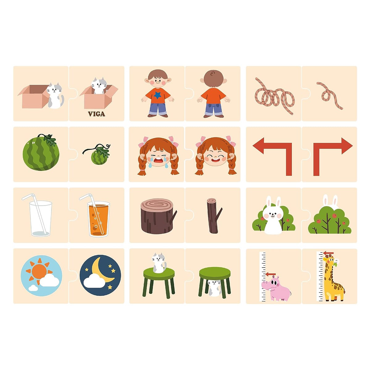 Puzzle de asociere din lemn, Opozitii de la Viga Toys este un joc educativ si distractiv, datorita caruia micutii vor invata prin joaca sa asocieze imaginile care arata notiuni opuse.