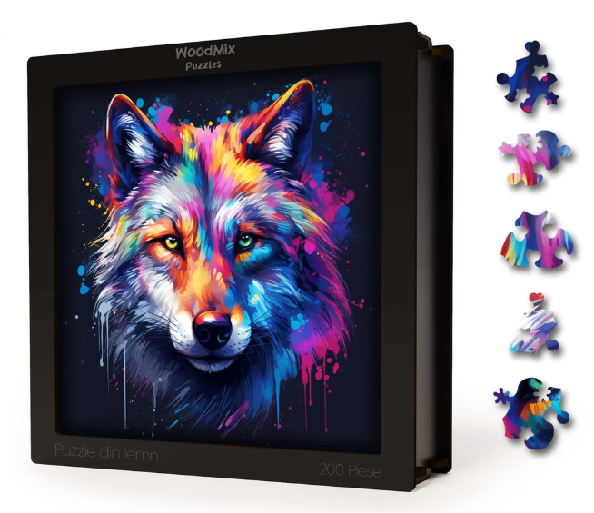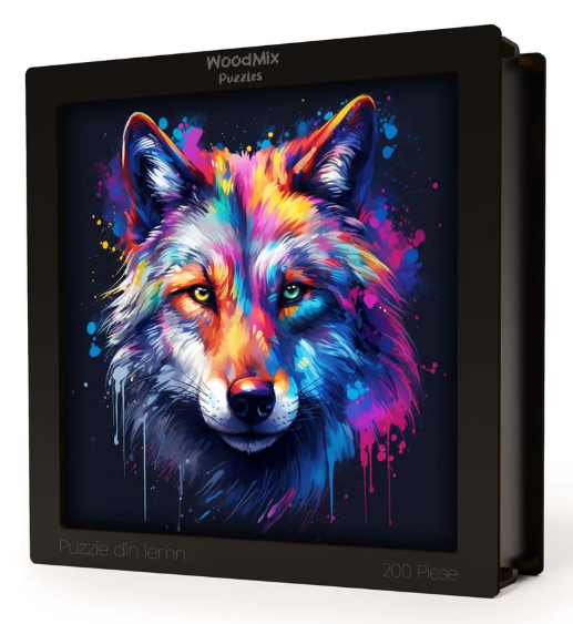 Acest puzzle din lemn reprezintă o imagine cu un lup și are 200 de piese unice.