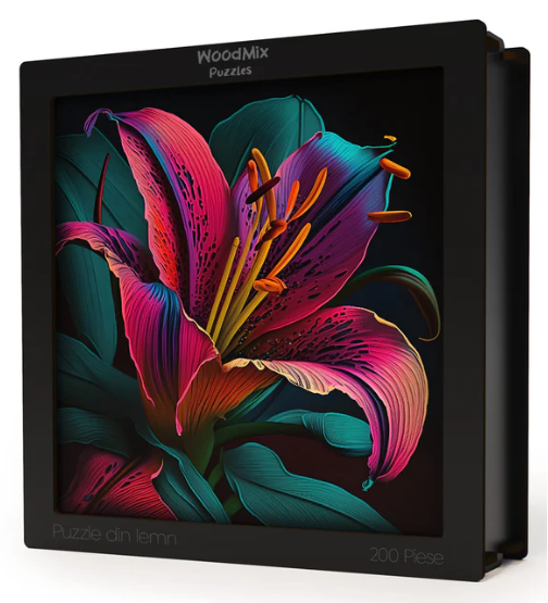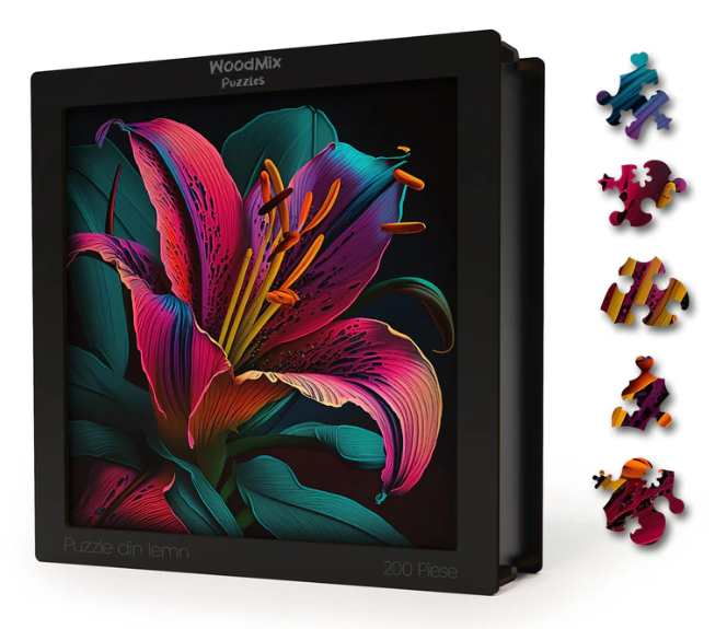 Acest puzzle din lemn reprezintă o imagine cu un crin și are 200 de piese unice.