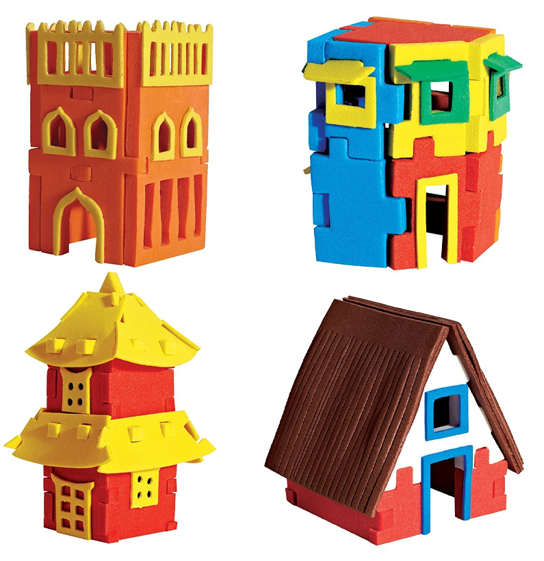 Acest set unic combină jocurile distractive și educative de tip puzzle, cu cele de construcție și modelare. Acum puteți realiza 13 modele de căsuțe 3D în miniatură, din spumă eva.
