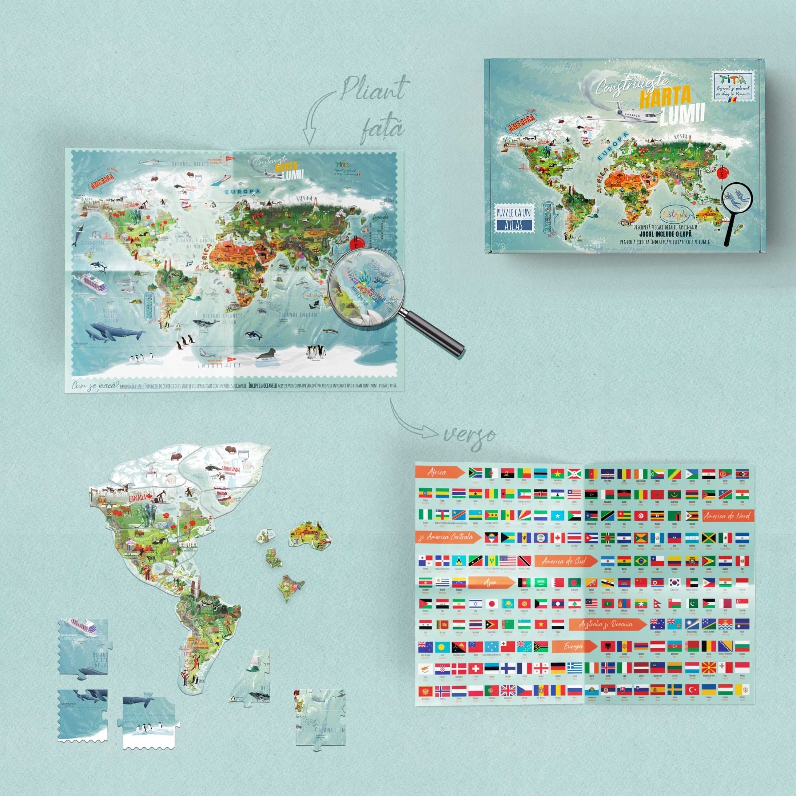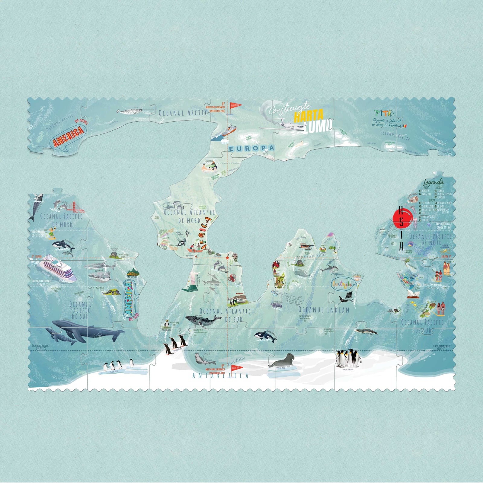 • Puzzle Mare (0.7 m x 0.5 m) cu 7 grupuri de piese (Oceane + 6 Continente) - TOTAL 74 piese, unele în formă clasică, de puzzle, și unele pe granița țărilor