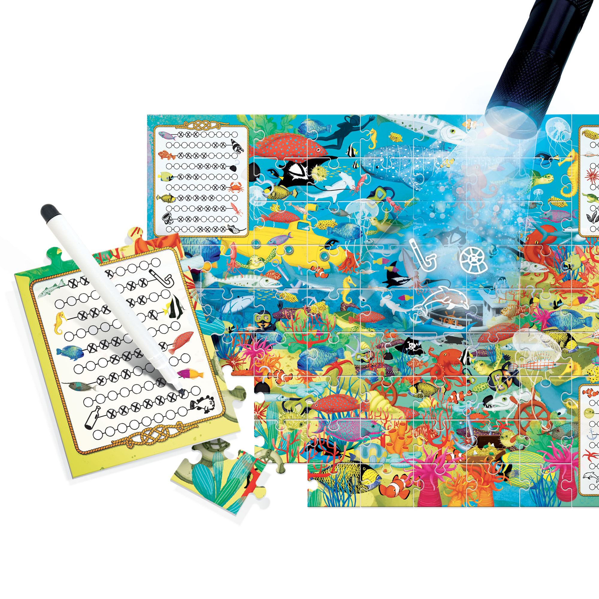 Setul include: puzzle cu dimensiunile de 60 x 44 cm format din 70 de piese, creion, Lanterna UV (functioneaza cu 3 baterii AAA 1.5 V, nu sunt incluse).