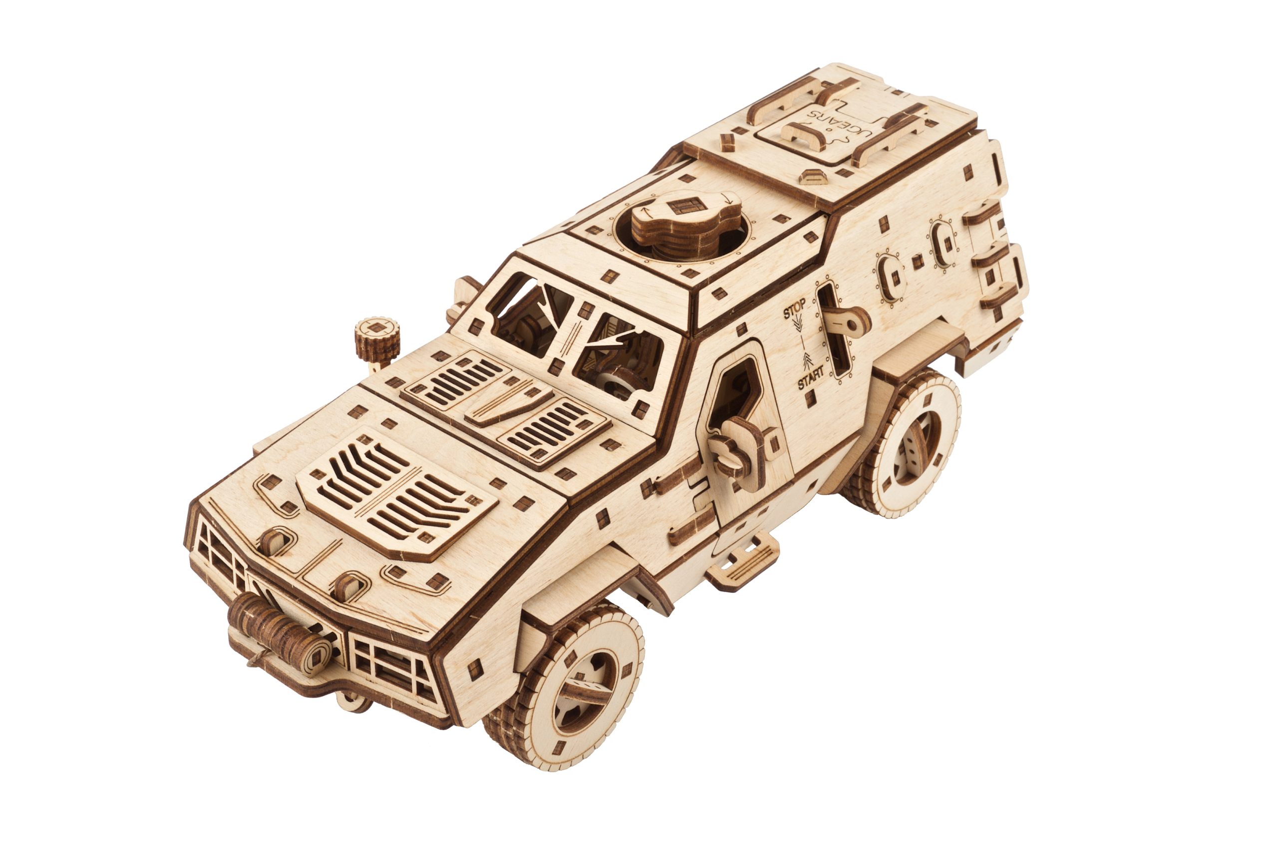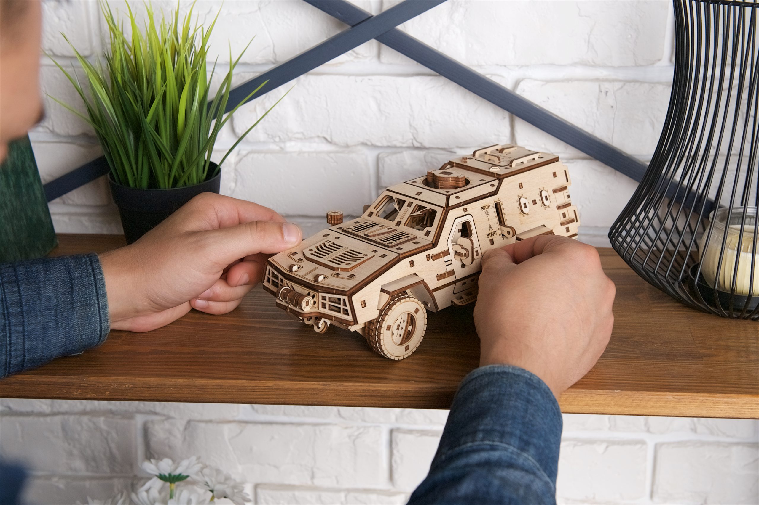 Modelul de puzzle mecanic 3D Dozor-B, vehicul blindat folosit pentru transportul de personal, poate fi un cadou inedit pentru orice pasionat de modele militare, istorie militară, camioane cu tracțiune integrală sau vehicule de luptă.