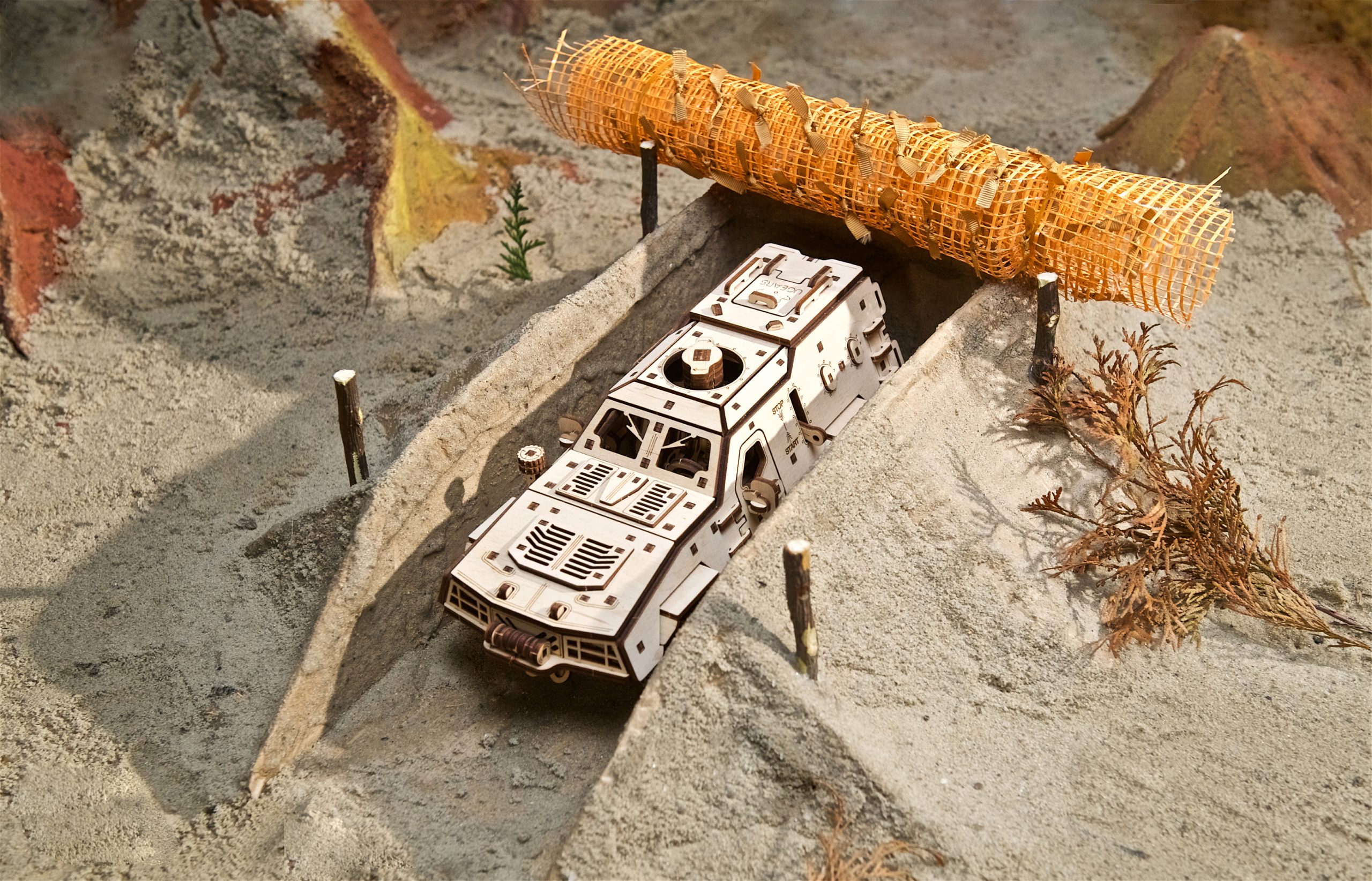 Are o “armură” de placaj gros de 3.7mm, tracțiune integrală, suspensie completă și un motor cu arc care îi permite să circule pe o distanță considerabilă (aproximativ 8 metri). Pentru că ne place să vă surprindem cu accesorii interesante, vehiculul de luptă Ugears Dozor-B dispune de un troliu funcțional, la fel ca analogul sau din lumea reală, pentru auto-recuperare sau recuperarea vehiculelor de greutate similară. Trageți de troliul montat pe bara din față, legați-l de un obiect și urmăriți-l în timp ce se deplasează!
