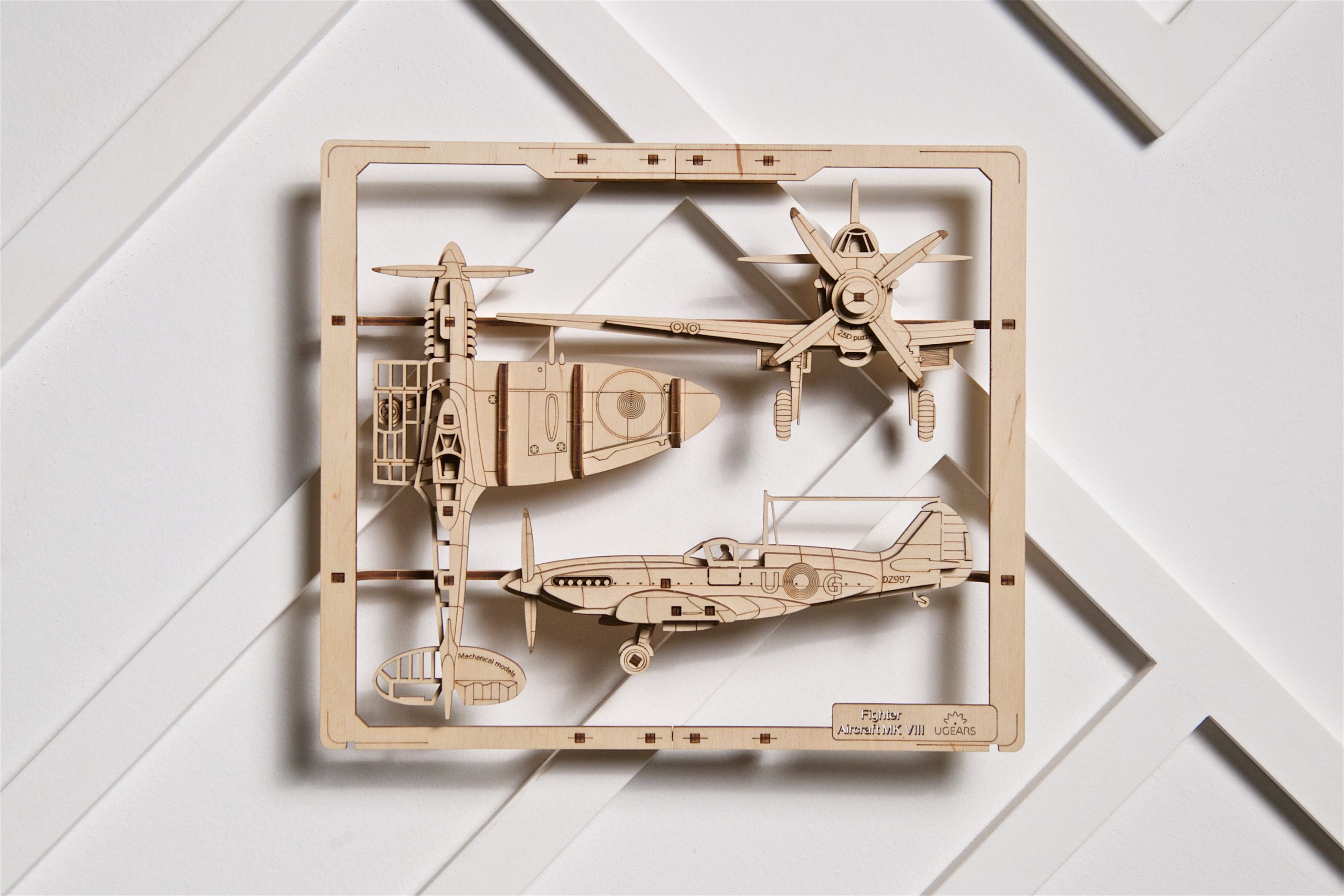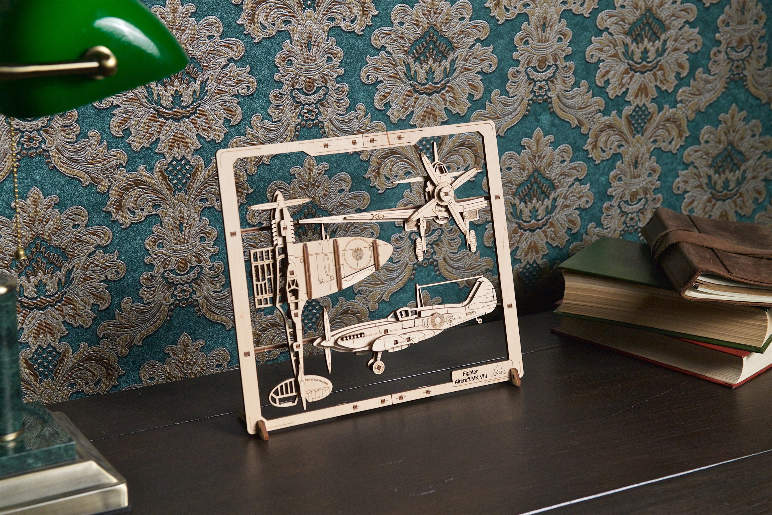 Puzzle-ul Fighter Aircraft 2.5D este un proiect DIY distractiv și o piesă de afișare atractivă pentru orice interior, fie acasă sau la birou. Puzzle-urile Ugears 2.5D sunt realizate din lemn de înaltă calitate, prezintă un design Ugears recunoscut și se asamblează fără lipici sau unelte speciale. Doar împingeți piesele pre-tăiate cu laser din plăci și prindeți-le împreună pentru a crea un model complet. Spectatorii pot explora avionul din trei unghiuri și pot interacționă cu părțile în mișcare.