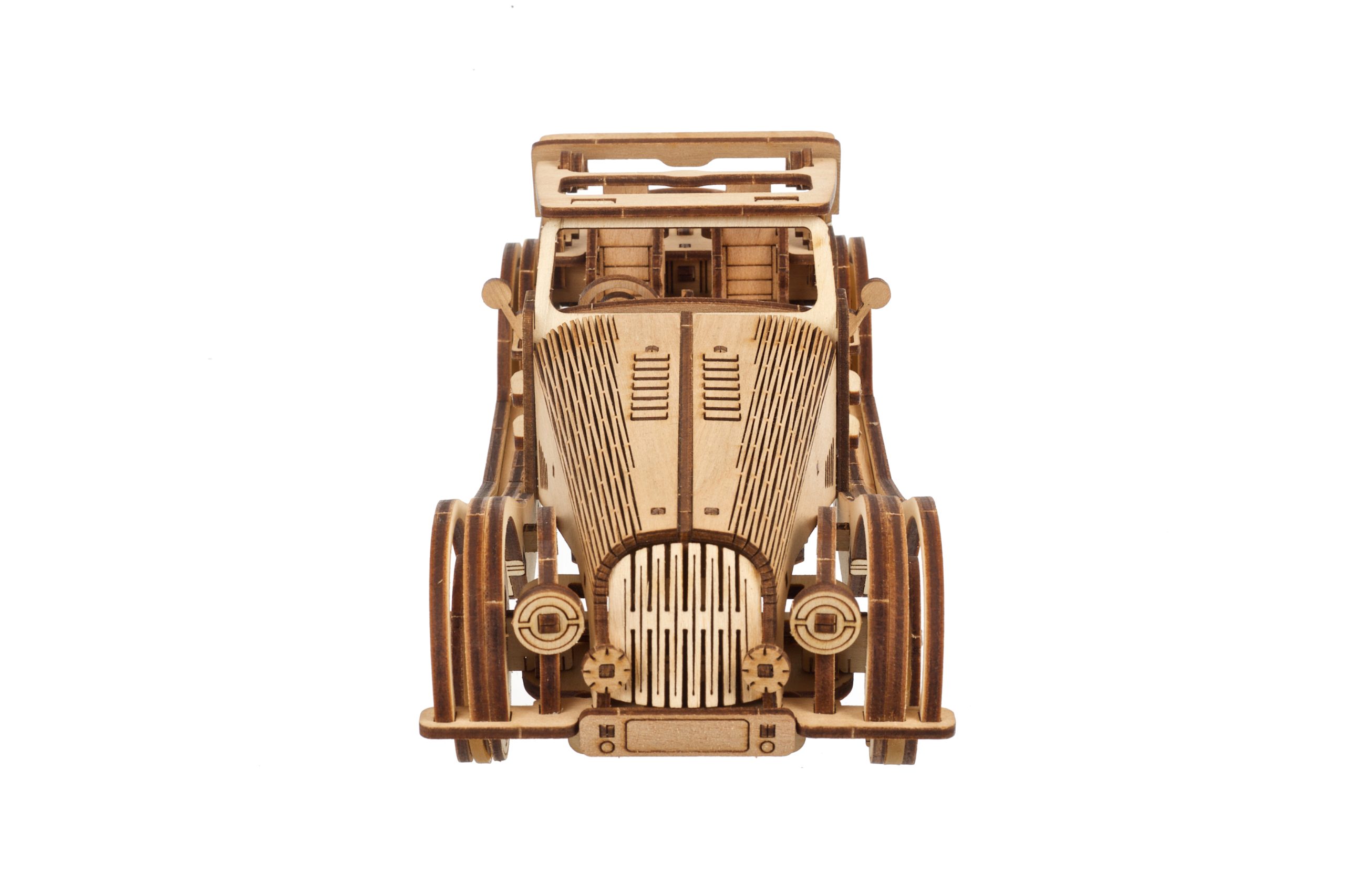 Modelul Sports Car are o functionalitate duala a motorului. Infasoara motorul cu arc cu sase rotatii complete ale cheii aflata pe partea de sub modelul de masina sau trage masina Rapid Mouse inapoi pe o suprafata plana, elibereaza-o si urmareste cum masina accelereaza, ca orice masina-jucarie cu tragere inapoi. Aceasta masina din lemn poate vira la stanga sau la dreapta prin ajustarea rotilor din fata, sau poate fi directionata in linie dreapta pentru distante mai lungi. Anvelopele din cauciuc ofera tractiune si sunt usor de montat si inlocuit. Ugears Sports Car Rapid Mouse prezinta o scalare realista, un interior minutios detaliat, o roata de rezerva functionala montata pe portbagaj si un acoperis manual.