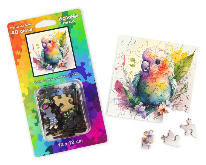 Acest puzzle din lemn reprezintă un papagal și are 40 de piese unice.