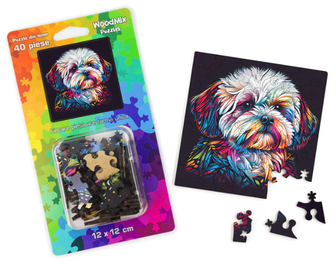 Acest puzzle din lemn reprezintă un cățeluș și are 40 de piese unice.