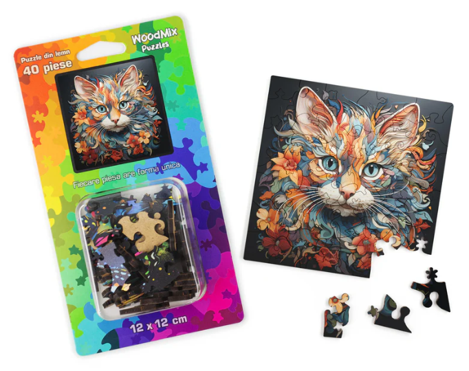 Acest puzzle din lemn reprezintă o pisicuță frumoasă și are 40 de piese unice.