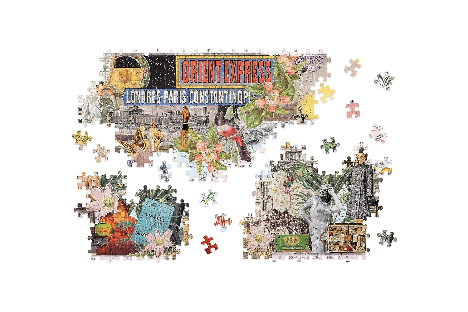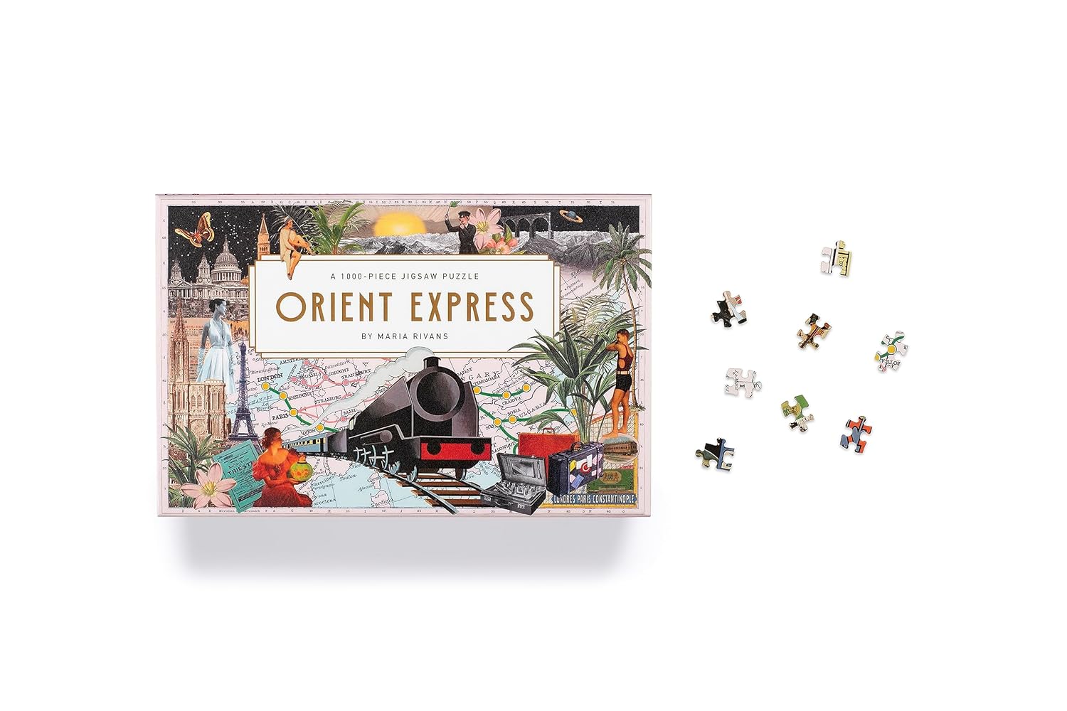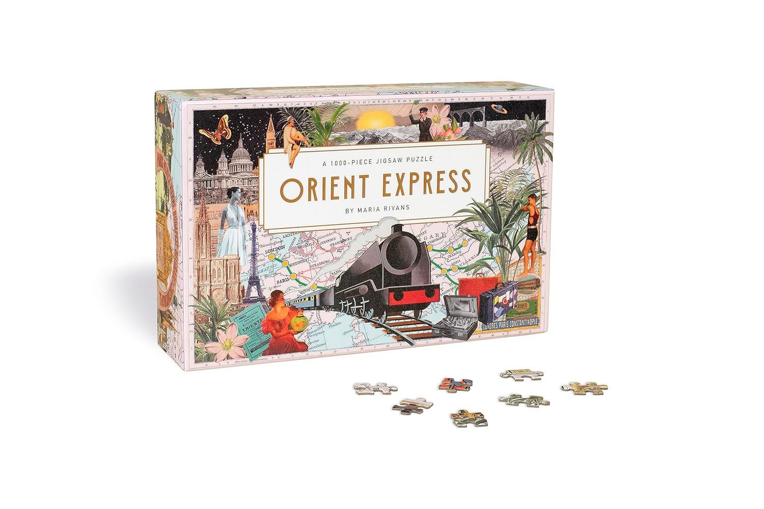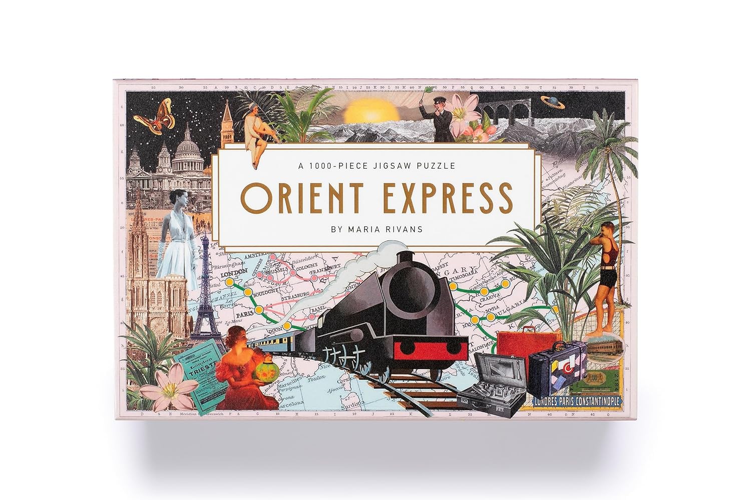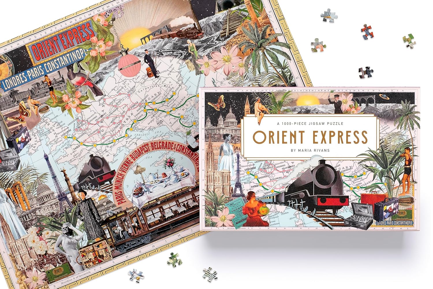 Alăturați-vă renumitei artiste de colaj Maria Rivans într-o călătorie nostalgică prin Europa, șerpuind prin inima continentului, veți fi încântați de o multitudine de priveliști cosmopolite și de peisaje spectaculoase, cu imagini intrigante de dinainte de război care evocă epoca aburului. Colajul include sute de imagini, prezentând toate opririle de pe rutele istorice Orient Express: Londra, Calais, Paris, Strasbourg, Zurich, Lausanne, Tunelul Simplon, Milano, Veneția, Trieste, Ljubljana, Zagreb, Innsbruck, Munchen, Viena, Budapesta, Belgrad, Sofia, București, Varna, Istanbul, Atena, Berlin și multe altele. Bazându-se în mare parte pe epoca de dinainte de război și fin de siècle, acest puzzle este atât o vedere misterioasă și primitoare a Europei, cât și o celebrare magnifică a erei aburului.
