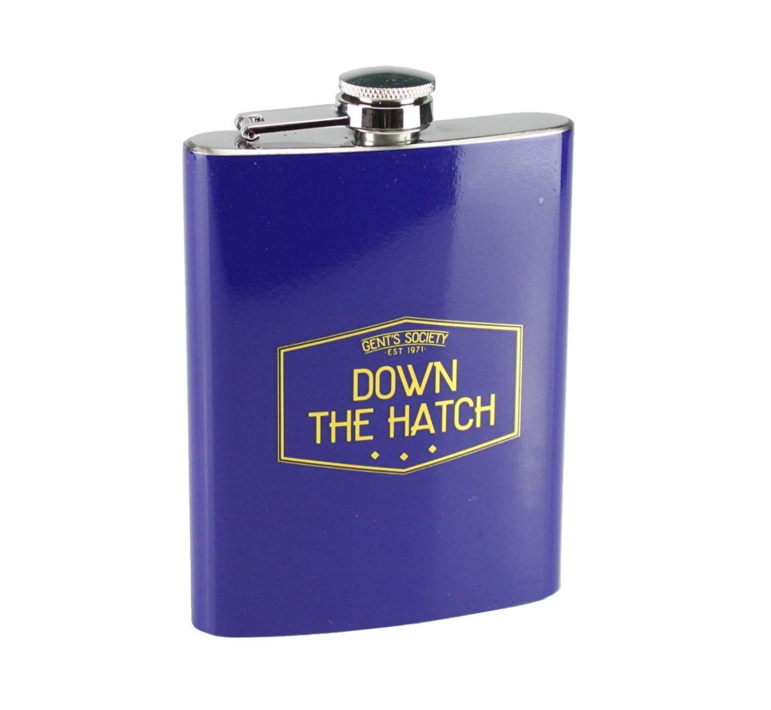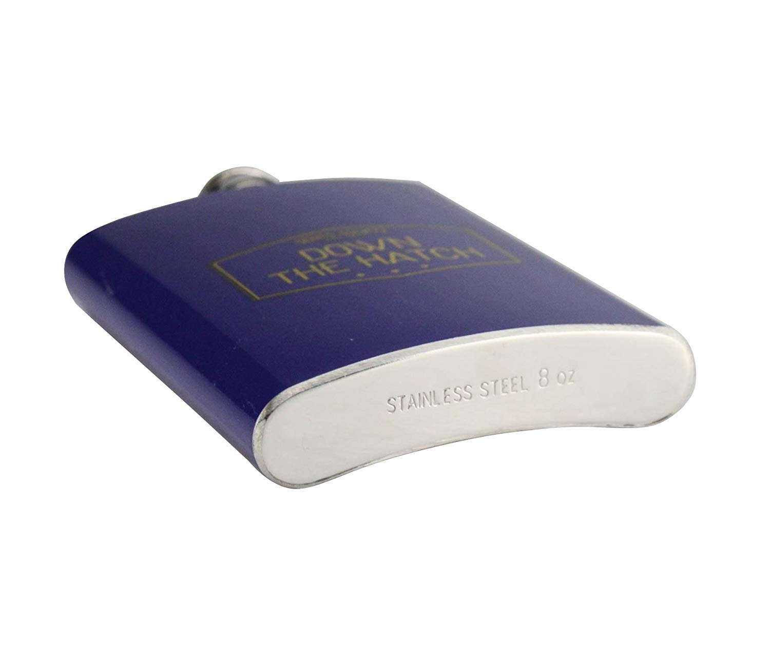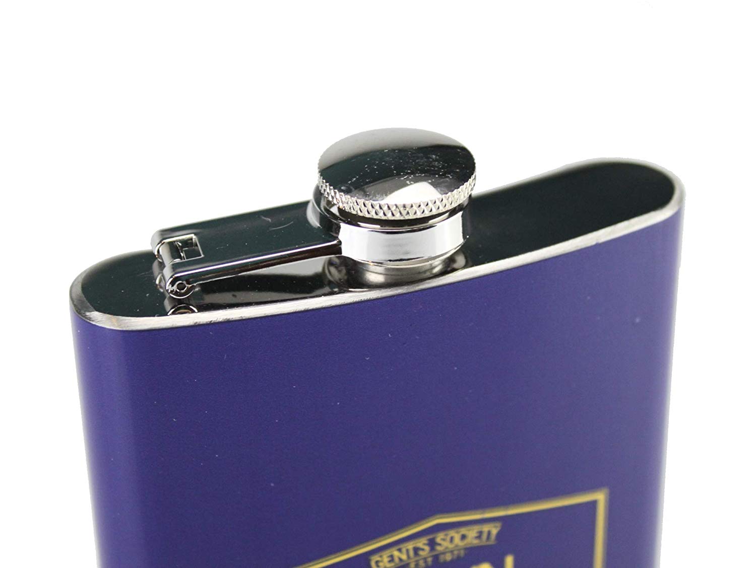 Ploscă din metal, cu gâtul scurt și strâmt, capacitate mică și corp rotund, turtit, ideală pentru a ține băutură preferată cât mai aproape.