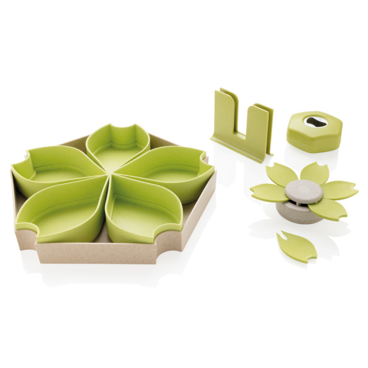 Set accesorii pentru bucătărie confecționate din paie de grâu, fiind biodegradabile sunt o alternativă ecologică la plastic. Setul este compus dintr-un bol mare, 5 boluri mici, 6 mini furculițe așezate în formă de floare, 1 suport pentru scobitori și un deschizător de sticle.