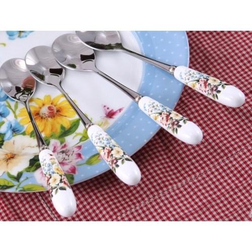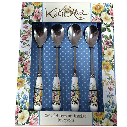 Pretty set of 4 porcelain handled tea spoons from the Katie Alice shabby chic 'English Garden' Collection.The floral pattern featured across the collection is an idea taken from a piece of vintage wallpaper the designer recently came across during a visit to an antique fair. Along with this pretty floral motif, Katie weaved into the design other well-loved English country garden elements: bees, birds and butterflies