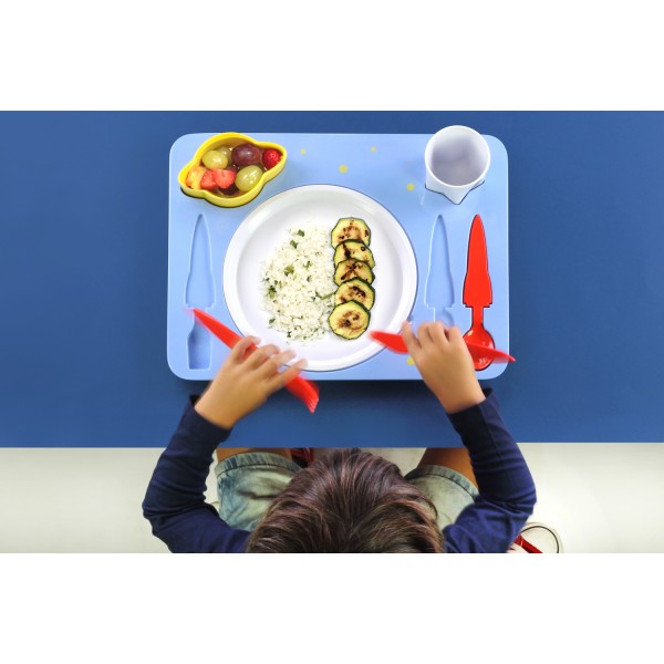 Cu aceste set pentru masa spatial copiii se vor distra in timp ce invata cum sa aseze o masa. Fiecare ustensila incape perfect in adanciturile din tava. Contine o tava, o farfurie, o furculita, un cutit, o lingura, un castron si un pahar.