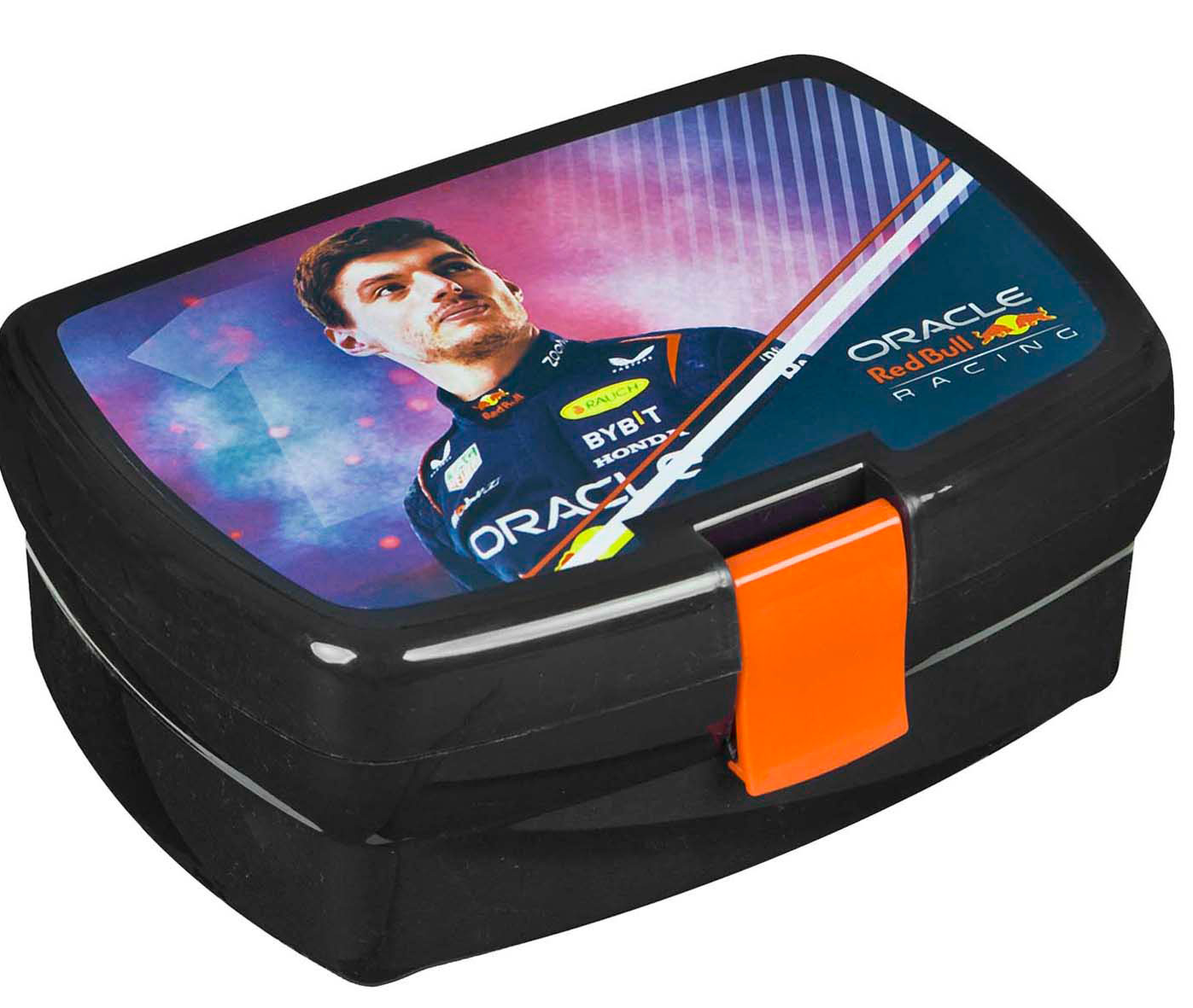 Cutie de prânz cu o imagine cu Max Verstappen și sigla Red Bull Racing.