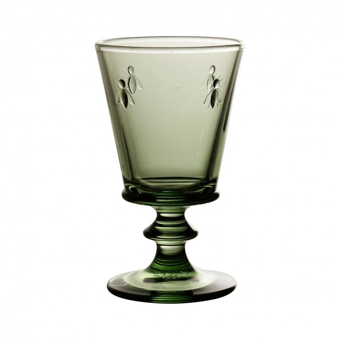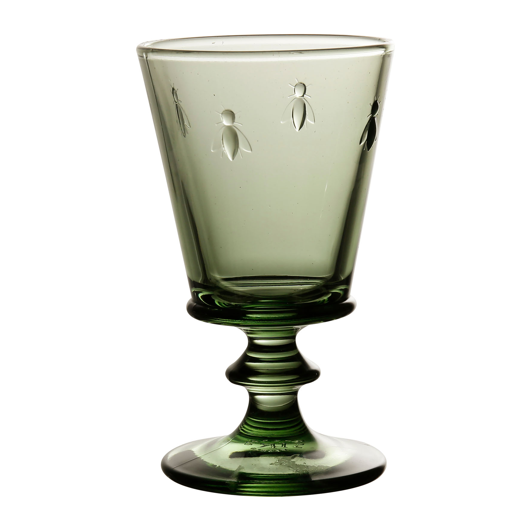 Pahar cu picior pentru vin din sticlă verde decorat cu albine în relief.