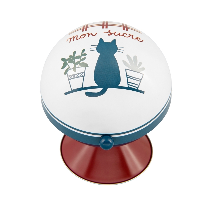 Recipient pentru zahăr sferic, cu picior, având pictată o pisică pe capac împreună cu mesajul ”mon sucre”.