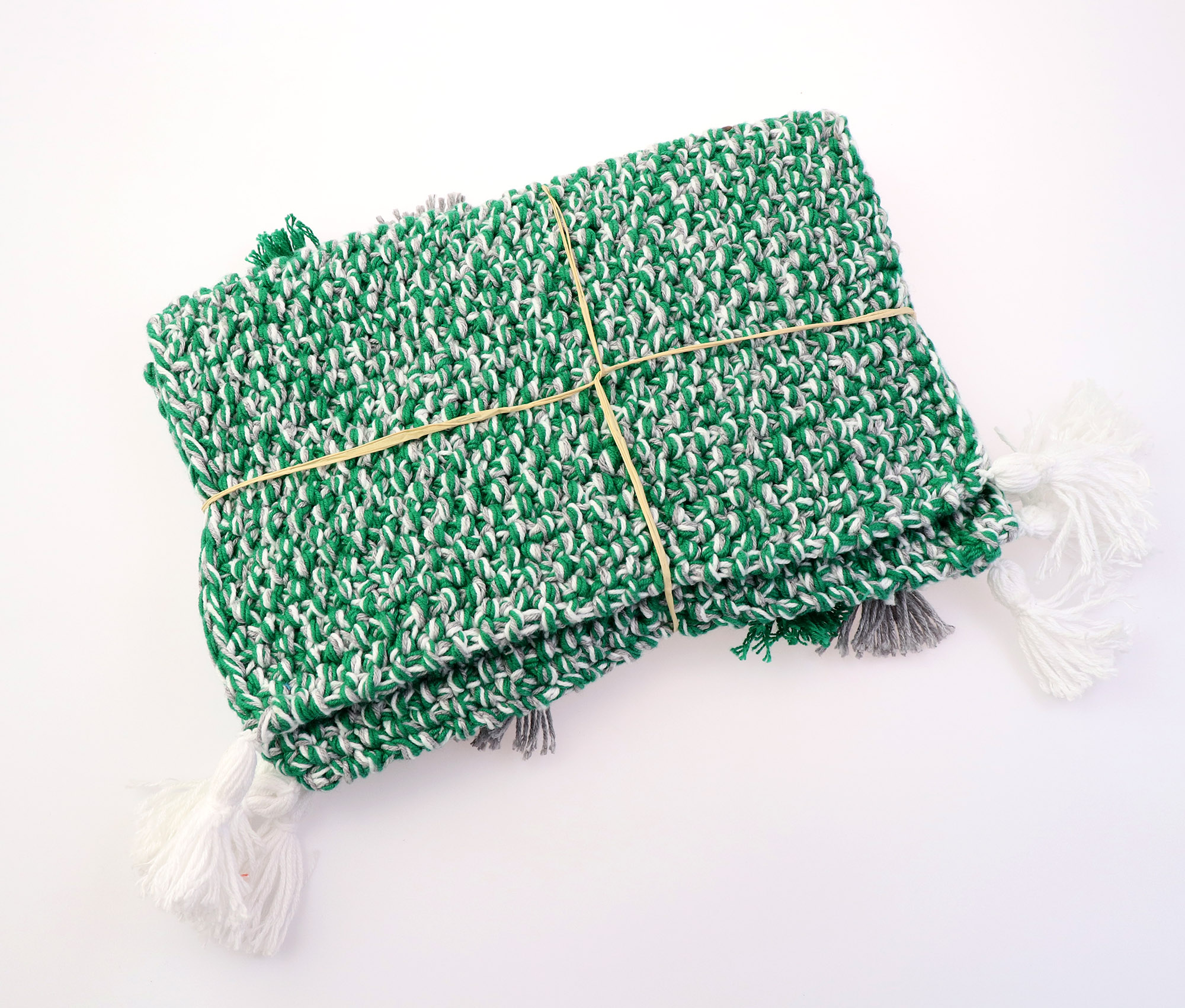 Set 2 suporturi pahare si 2 suporturi farfurii cu ciucuri, tricotate manual