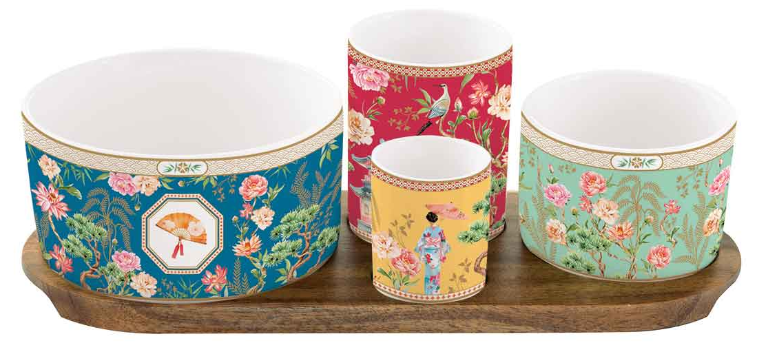 Set servire aperitive "Jardins D"Orient", fabricat din portelan, cu tava de servire din lemn de acacia, marca Nuova R2S.
