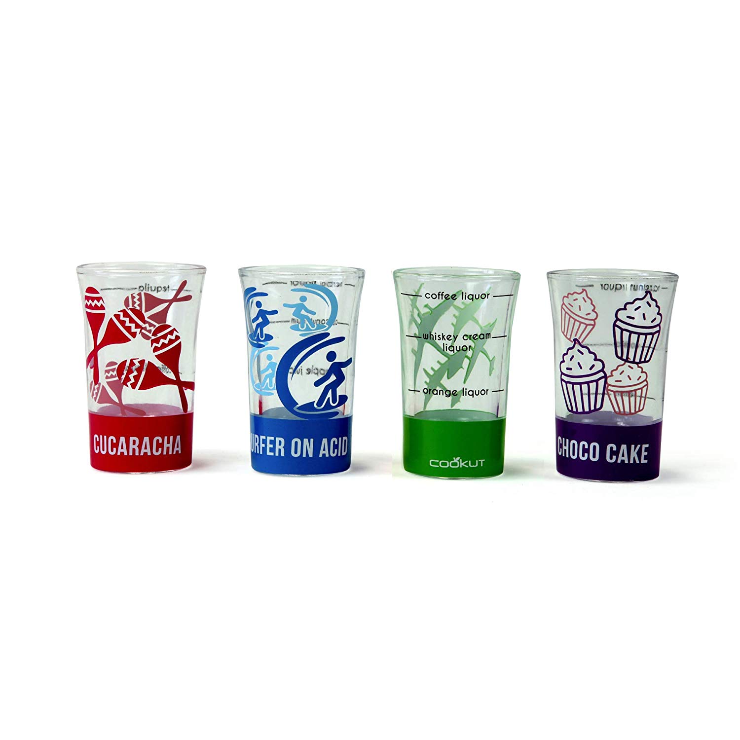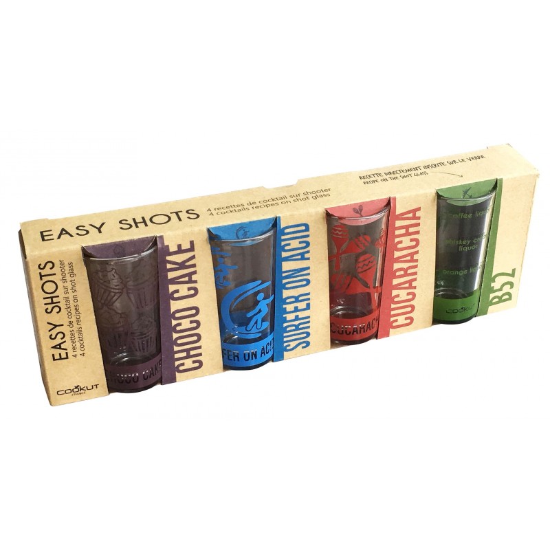 Set 4 pahare pentru shoturi, viu colorate, fiecare inscriptionat cu o reteta celebra