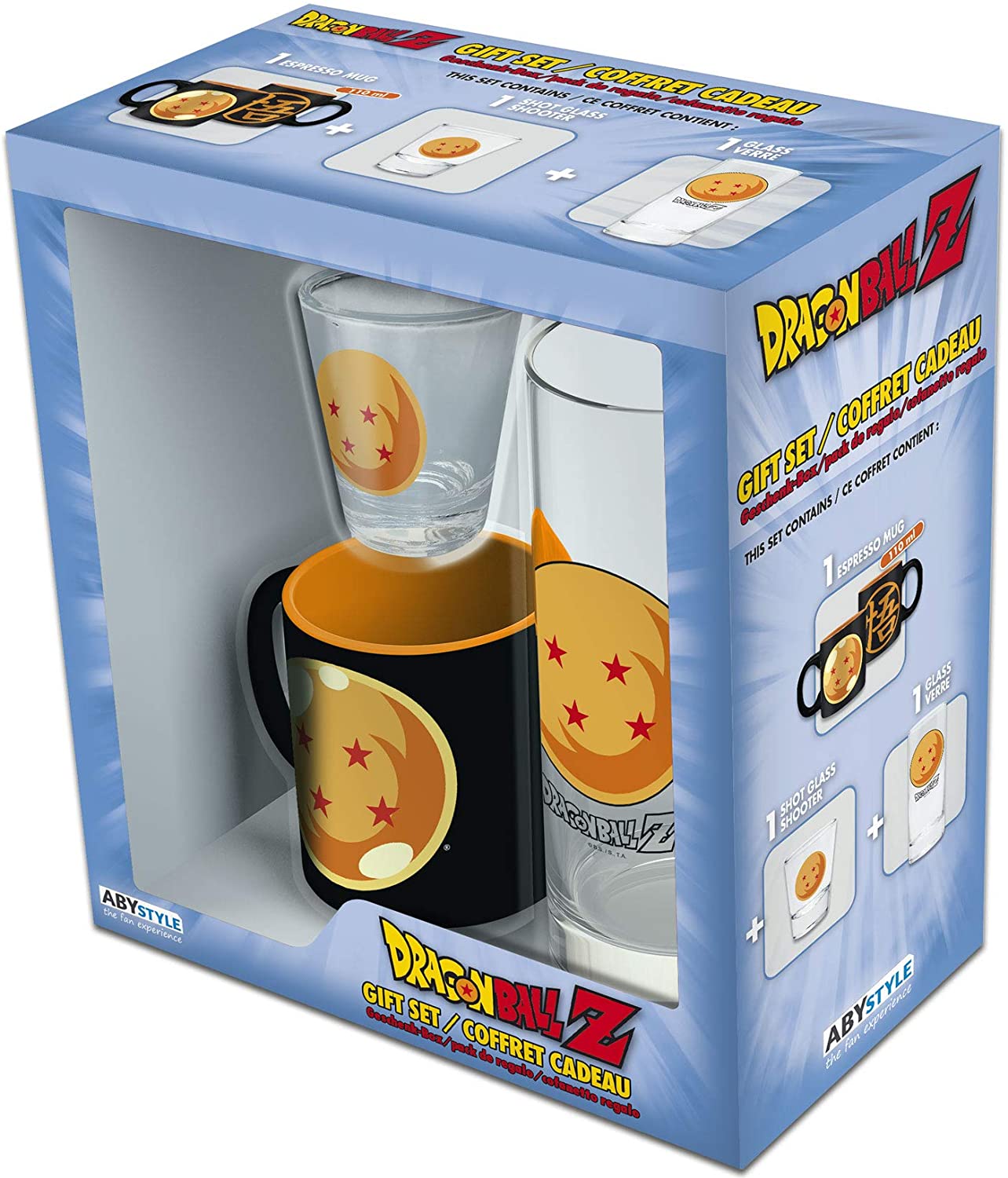 Un set compus dintr-o cană și două pahare, ideale pentru fanii seriei manga - Dragon Ball Z. Cana este realizată din ceramică și are o capacitate de 110 ml. Paharul de tip shooter are 50 de ml și cel clasic 290 ml.