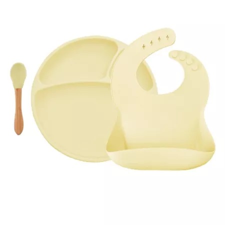 Setul conține: Farfurie din silicon compartimentată x 1; Bavetă din silicon x 1; Linguriță din bambus cu vârf din silicon x 1.