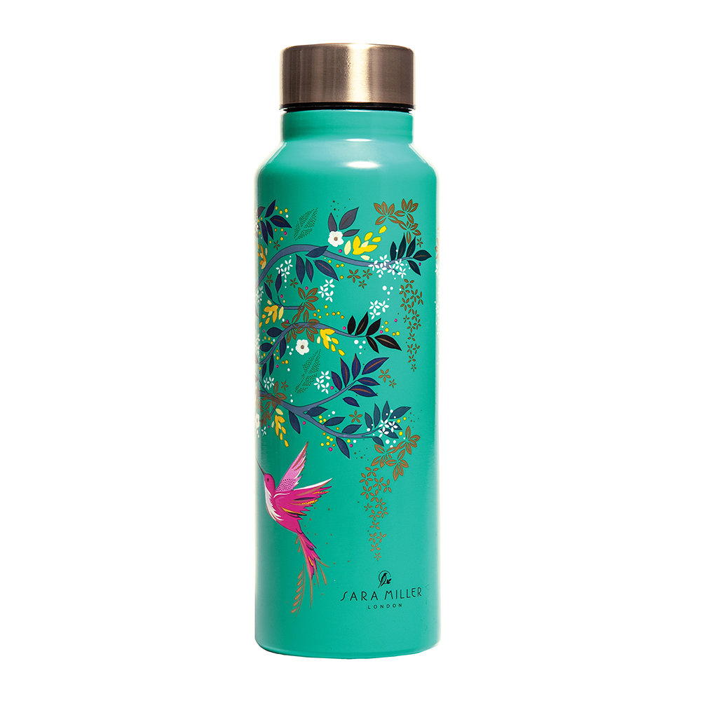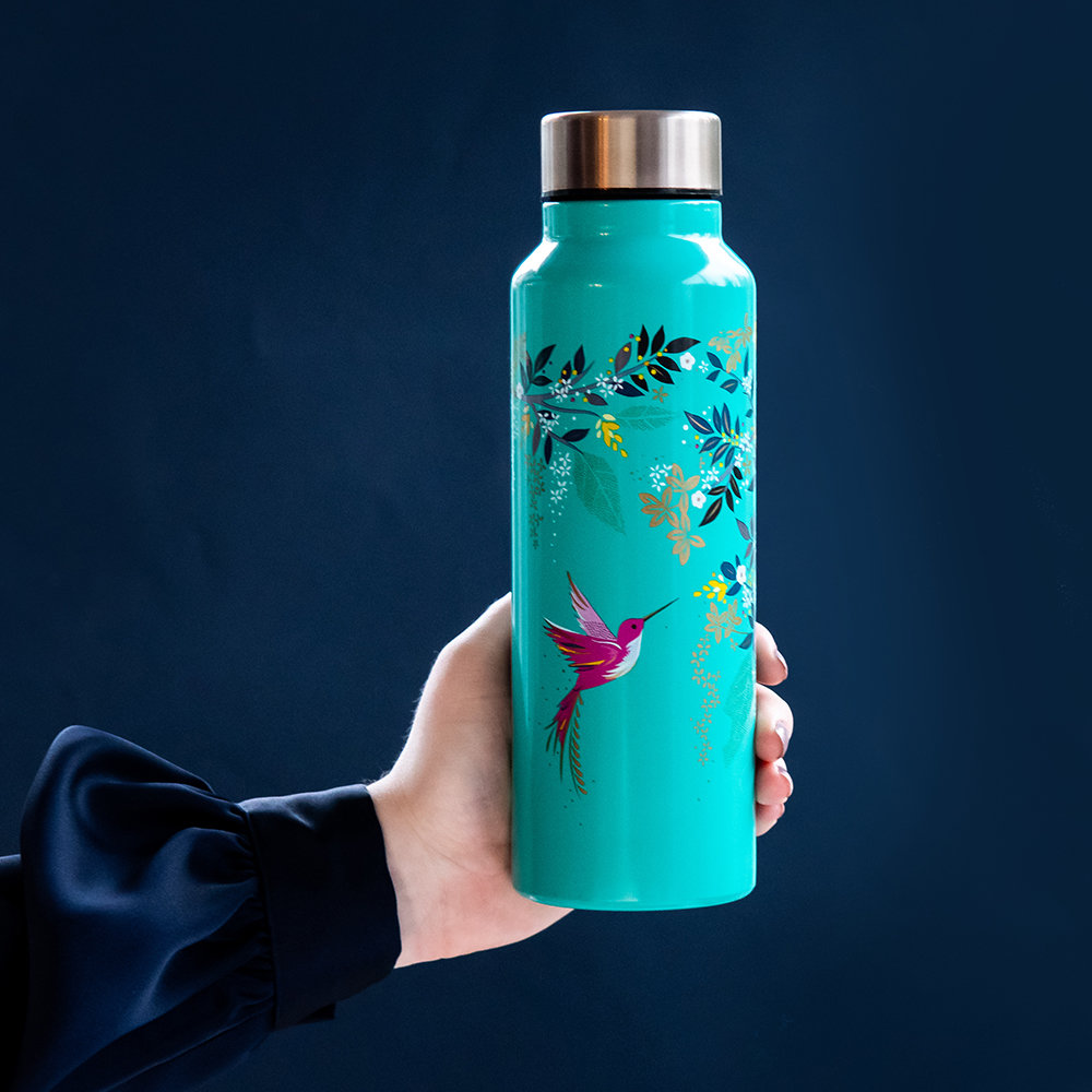 Adauga un strop de culoare atunci cand te hidratezi cu aceasta sticla de apa, model cu pasari colibri intr-un decor tropical, semnat Sara Miller.