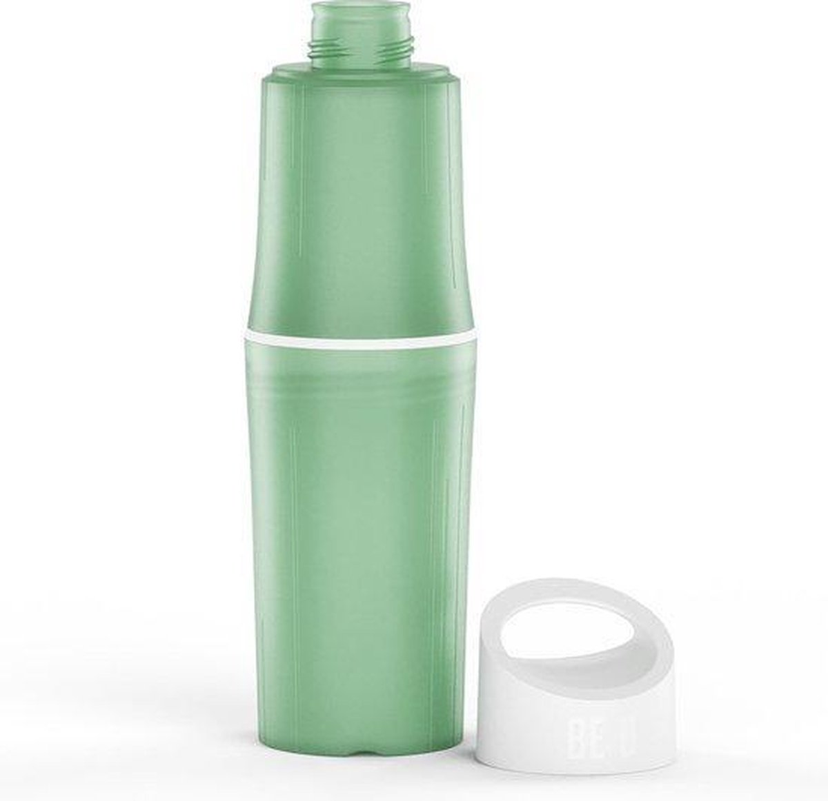 Sticla pentru apă Be O este 100% reciclabilă fiind fabricată din trestie de zahăr. Având un design modular ocupă puțin spațiu și poate fi spălată cu ușurință.