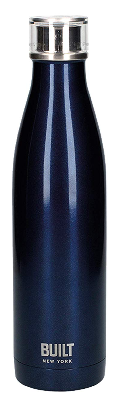 Acest termos în formă de sticlă este fabricat din oțel inoxidabil cu pereți dubli și capac din plastic.